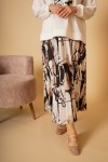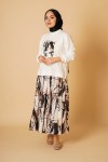 Yazın enerjisini yansıtan eteğimiz, saten kumaşın renkli ve canlı dokusuyla öne çıkıyor. Üst kısmı bambu kumaştan üretilerek konforu ve şıklığı bir araya getiriyor. Renklerin uyumlu ön baskısı, eteğe dinamik bir hava katarken, yaka kısmındaki detayı tasarımı mükemmel bir şekilde tamamlıyor. Bu etek, yaz havasının renklerini taşıyarak zarafet ve rahatlık arayanlar için ideal bir tercih.