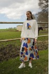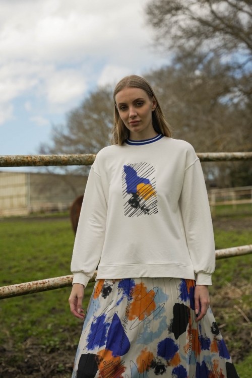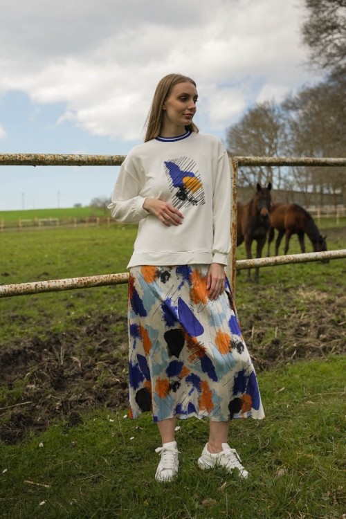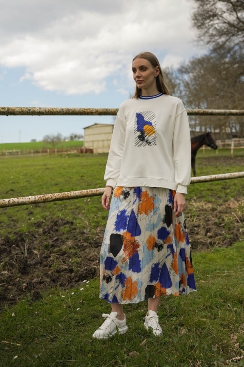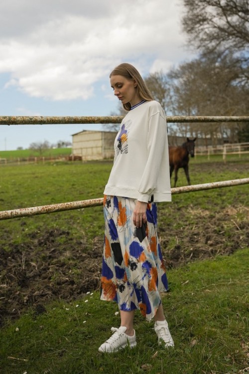 Yazın enerjisini yansıtan eteğimiz, saten kumaşın renkli ve canlı dokusuyla öne çıkıyor. Üst kısmı bambu kumaştan üretilerek konforu ve şıklığı bir araya getiriyor. Renklerin uyumlu ön baskısı, eteğe dinamik bir hava katarken, yaka kısmındaki ribana detayı tasarımı mükemmel bir şekilde tamamlıyor. Bu etek, yaz havasının renklerini taşıyarak zarafet ve rahatlık arayanlar için ideal bir tercih.