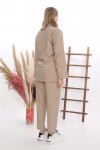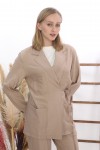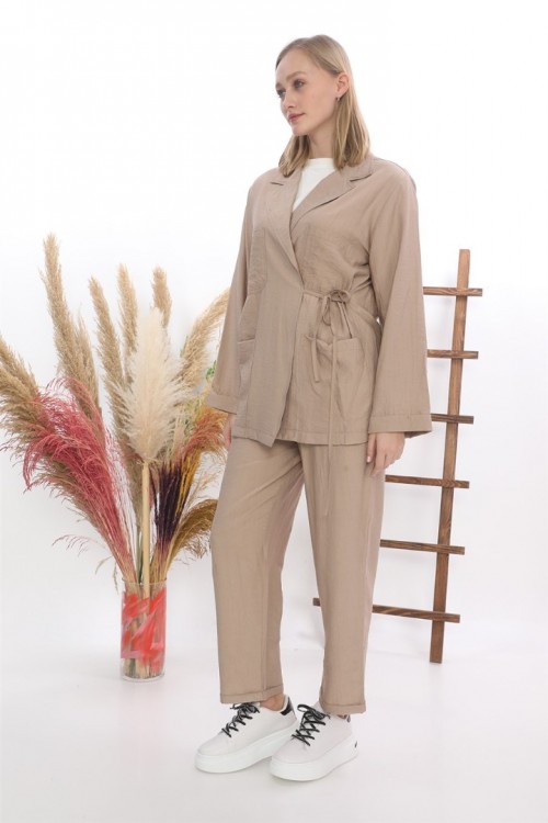 Bu ikili takım, beli bağlamalı ceket ve cepli, kol katlamalı, hafif ve yumuşak kumaşıyla serin tutan özelliklere sahip. Muhteşem tasarımı, şıklığınıza şıklık katarken pantolonuyla birleşerek tam bir ikili takım oluşturuyor. Stilinizi vurgulayan detaylarıyla sizi şık ve rahat bir şekilde günün her anında öne çıkaracak.