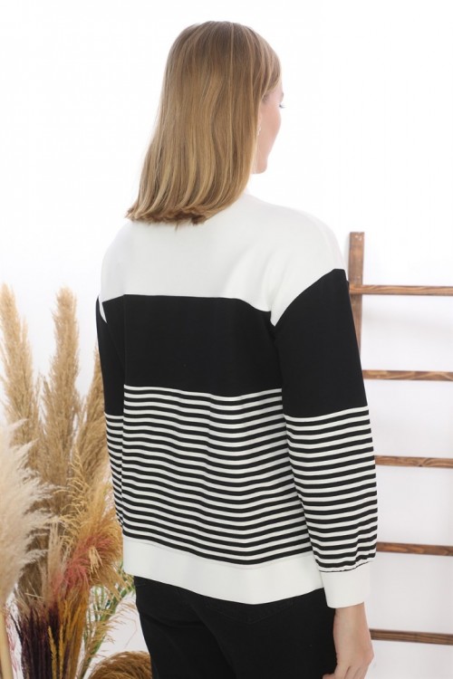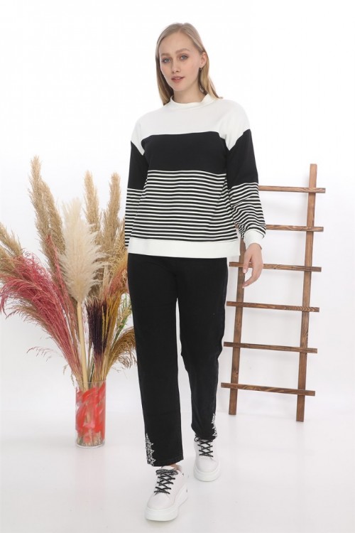 "Siyah beyaz çizgilerle şıklığınıza renk katan, yumuşacık, tüylenmeyen ve solmayan siyah renkteki kısa tunik, özel bambu kumaşıyla konforu en üst düzeye çıkarıyor. Modern tasarımı ve kaliteli malzemesiyle öne çıkan bu ürün, günlük şıklığınıza dinamik bir dokunuş katıyor. Gardırobunuzun vazgeçilmezi olacak bu tunik , hem stilinizi tamamlıyor hem de gün boyu konfor sunuyor.