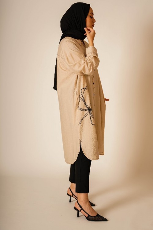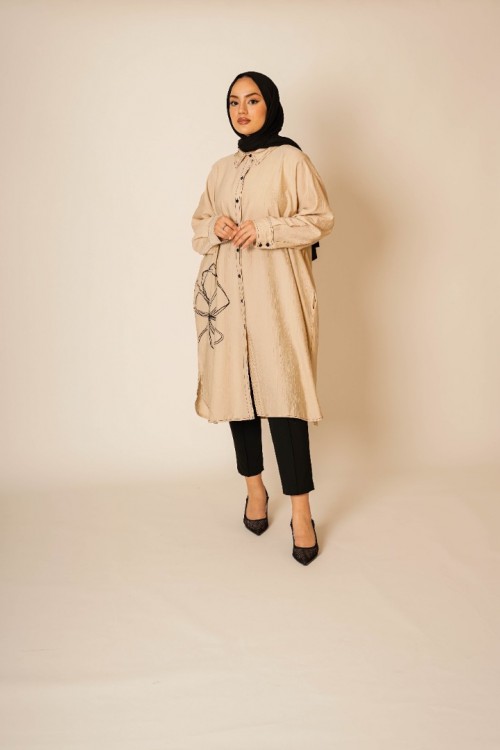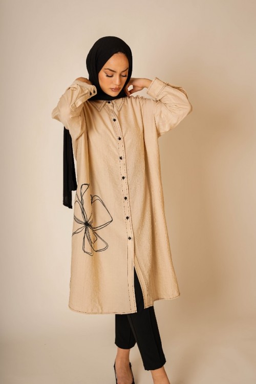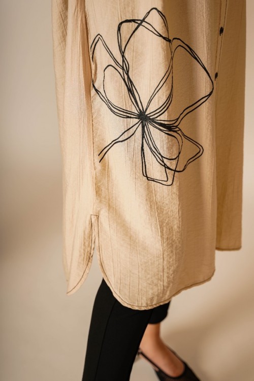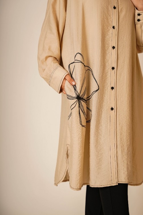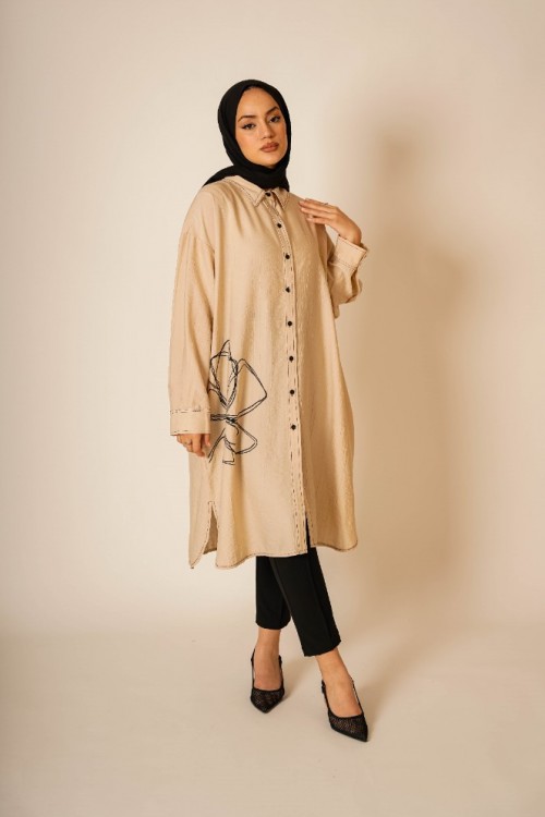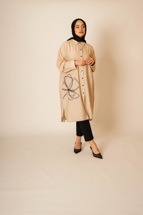 Bu şık ve rahat gömlek tunik, hem günlük kullanım hem de özel günler için ideal bir parça. Hafif kumaşı ve rahat kesimi ile gün boyu konfor sunar. Göğüs hizasında yer alan zarif çiçek deseni, tuniğe modern ve sofistike bir dokunuş katar. Düğme detayları ve geniş manşetleri ile klasik gömlek stilini yansıtır.