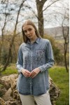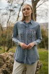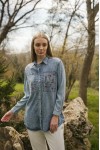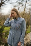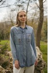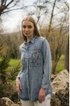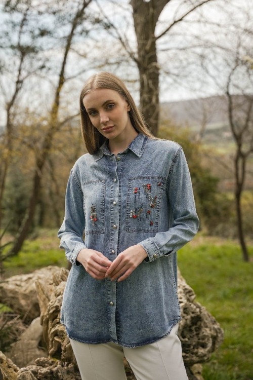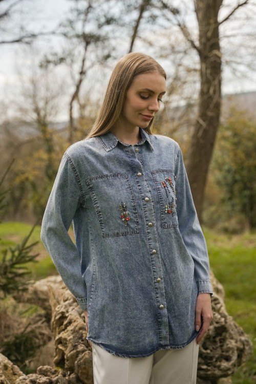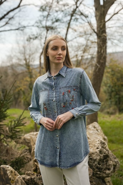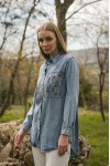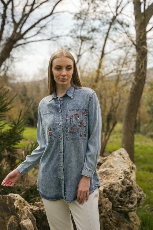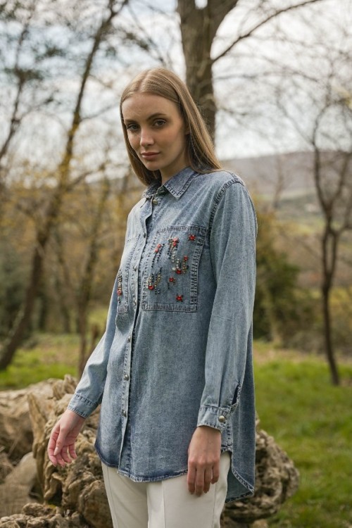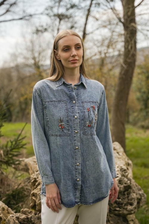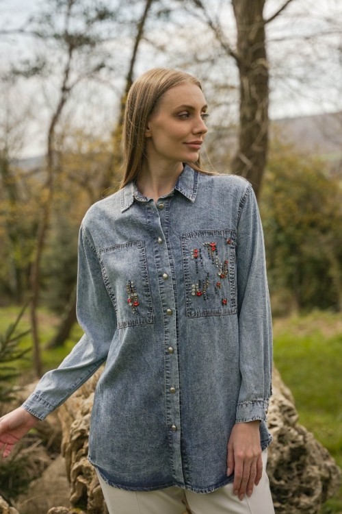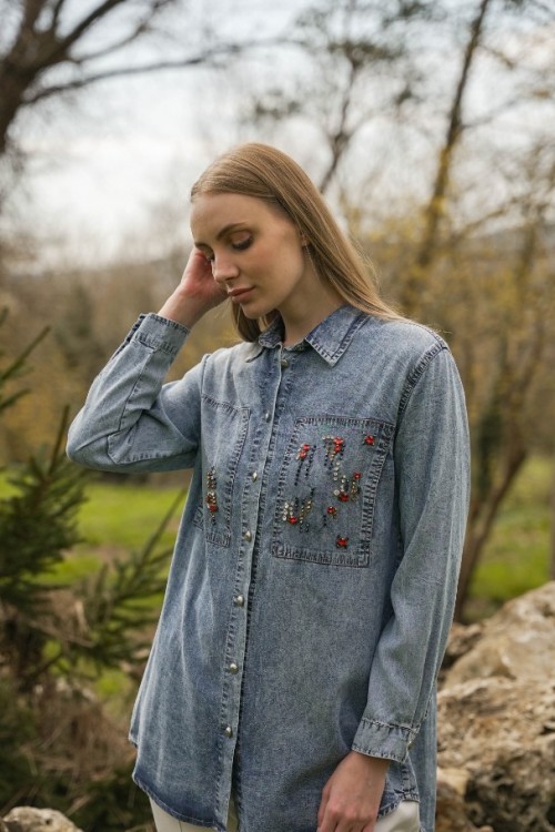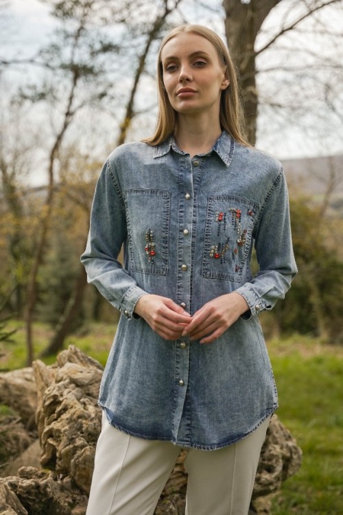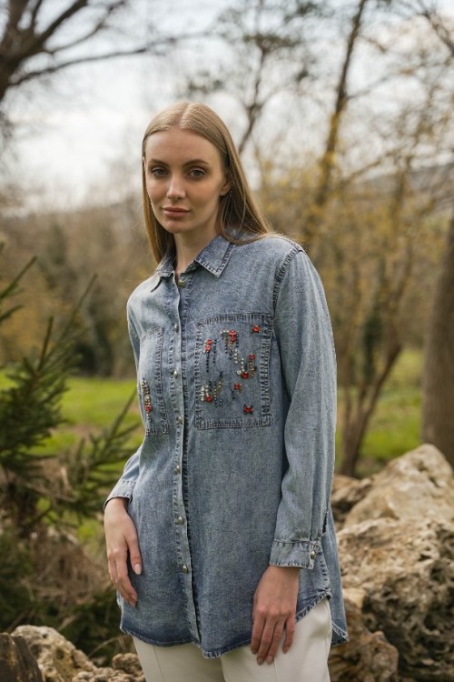 Denim Taş İşlemeli Cepli Gömlek Tunik KZ04-7118